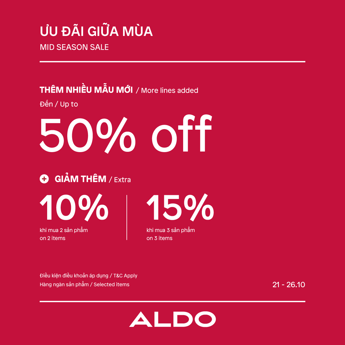 ưu đãi lên đến 50%, đặc biệt: Mua từ 02 sản phẩm, giảm thêm 10% Mua từ 03 sản phẩm, giảm thêm 15% Đến ngay cửa hàng ALDO bạn