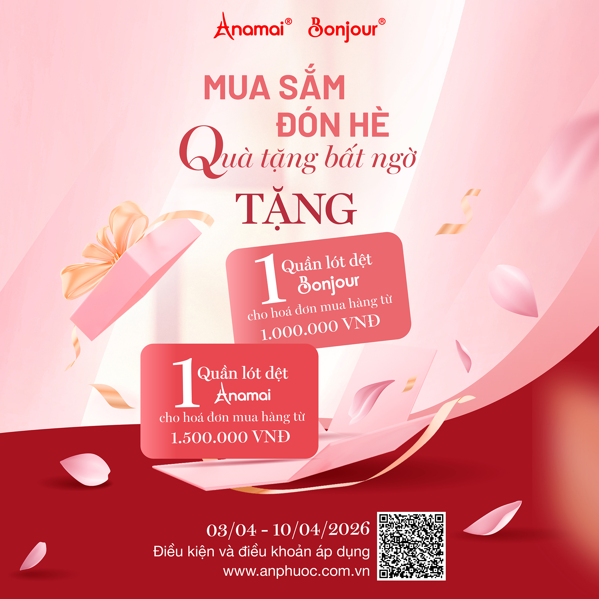 cho hóa đơn sản phẩm nguyên giá từ 3.000.000 VNĐ. 2. Dành cho Phái đẹp tinh tế (Anamai - Bonjour): • Tặng 1 quần lót dệt Bonjour cho
