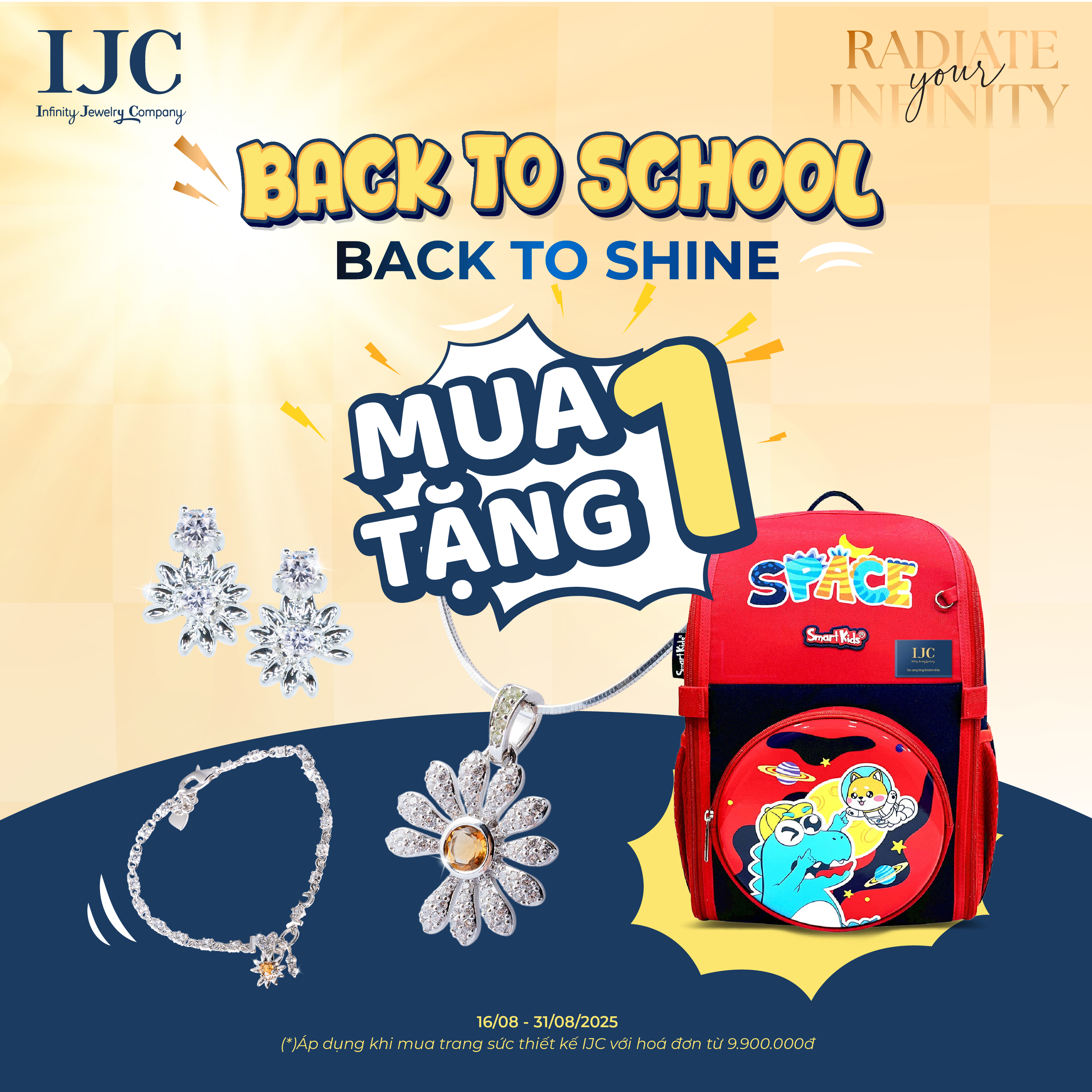 Mùa tựu trường không chỉ là lúc trẻ em háo hức trở lại lớp, mà còn là dịp để người lớn “tỏa sáng trở lại” theo cách riêng của mình. Và khi bạn chọn một món trang sức để đánh dấu cột mốc mới, IJC gửi thêm bạn ƯU ĐÃI MUA 1 TẶNG 1: 🎁 TẶNG 1 BALO CHỐNG GÙ CAO CẤP khi mua trang sức thiết kế IJC. 📅 Thời gian: 16.08 – 31.08.2025. 📍 Chương trình áp dụng cho hoá đơn từ 9.900.000đ. 📍 Áp dụng tại tất cả cửa hàng IJC trên toàn quốc. *Không áp dụng đồng thời với các CTKM, quà tặng khác. Vì món trang sức đẹp nhất luôn gắn với một kỷ niệm đáng nhớ. Hãy để IJC cùng bạn bắt đầu mùa mới thật rạng rỡ cho chính bạn và cả người thân yêu luôn ở bên cạnh.