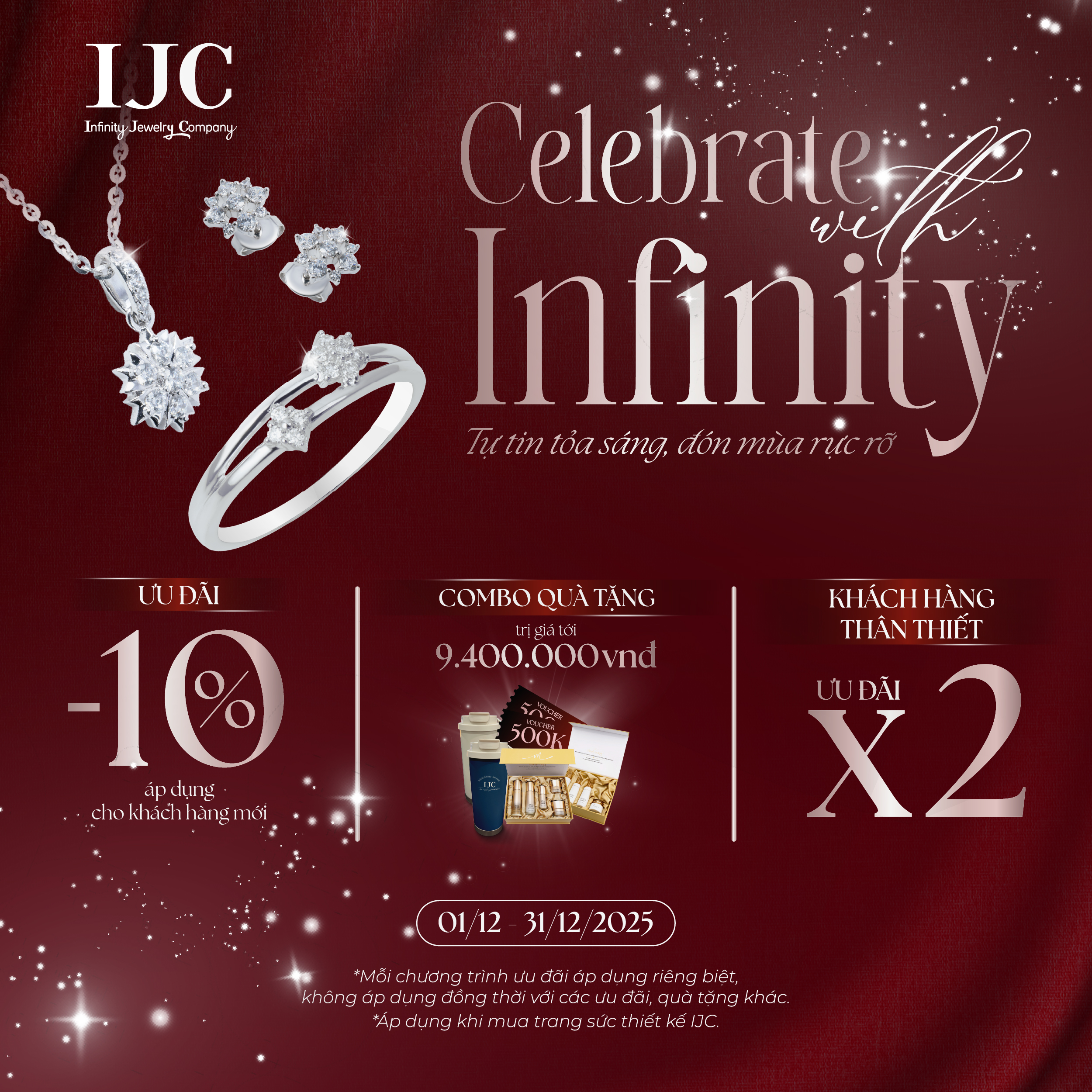 Tháng 12 là thời khắc những ánh đèn lễ hội bắt đầu sáng lên trên từng con phố, đây cũng là lúc chúng ta nhìn lại hành trình đã đi qua và trân trọng vẻ đẹp mà bản thân đã nuôi dưỡng suốt một năm dài. Với IJC, trang sức không chỉ là món phụ kiện điểm tô bên ngoài, mà còn là dấu ấn của sự tự tin, của những khoảnh khắc rực sáng và phong thái riêng mà mỗi chúng ta luôn gìn giữ. Để tôn vinh điều ấy trong mùa lễ hội đang đến, IJC mang đến chương trình ưu đãi đặc biệt: - Giảm ngay 1O% đối với khách hàng mới. - Combo quà tặng giá trị lên đến 9.4OO.OOOđ. - Ưu đãi nhân đôi dành cho khách hàng thân thiết. * Thời gian: 01/12 – 31/12/2025. *Mỗi chương trình áp dụng riêng biệt, không áp dụng đồng thời với các ưu đãi, quà tặng khác. Hãy để IJC đồng hành cùng bạn bước vào mùa rực rỡ này, bất kể trong những khoảnh khắc đặc biệt hay những ngày bình thường nhất. -------------------------- CÔNG TY CỔ PHẦN TRANG SỨC ĐÁ QUÝ INFINITY 💎 Trang sức thiết kế độc bản - thu đổi lên đến 1OO% + Hotline: 1900 636 774 #IJC #TrangsucdaquyIJC #toasangtungkhoanhkhac #CelebratewithInfinity