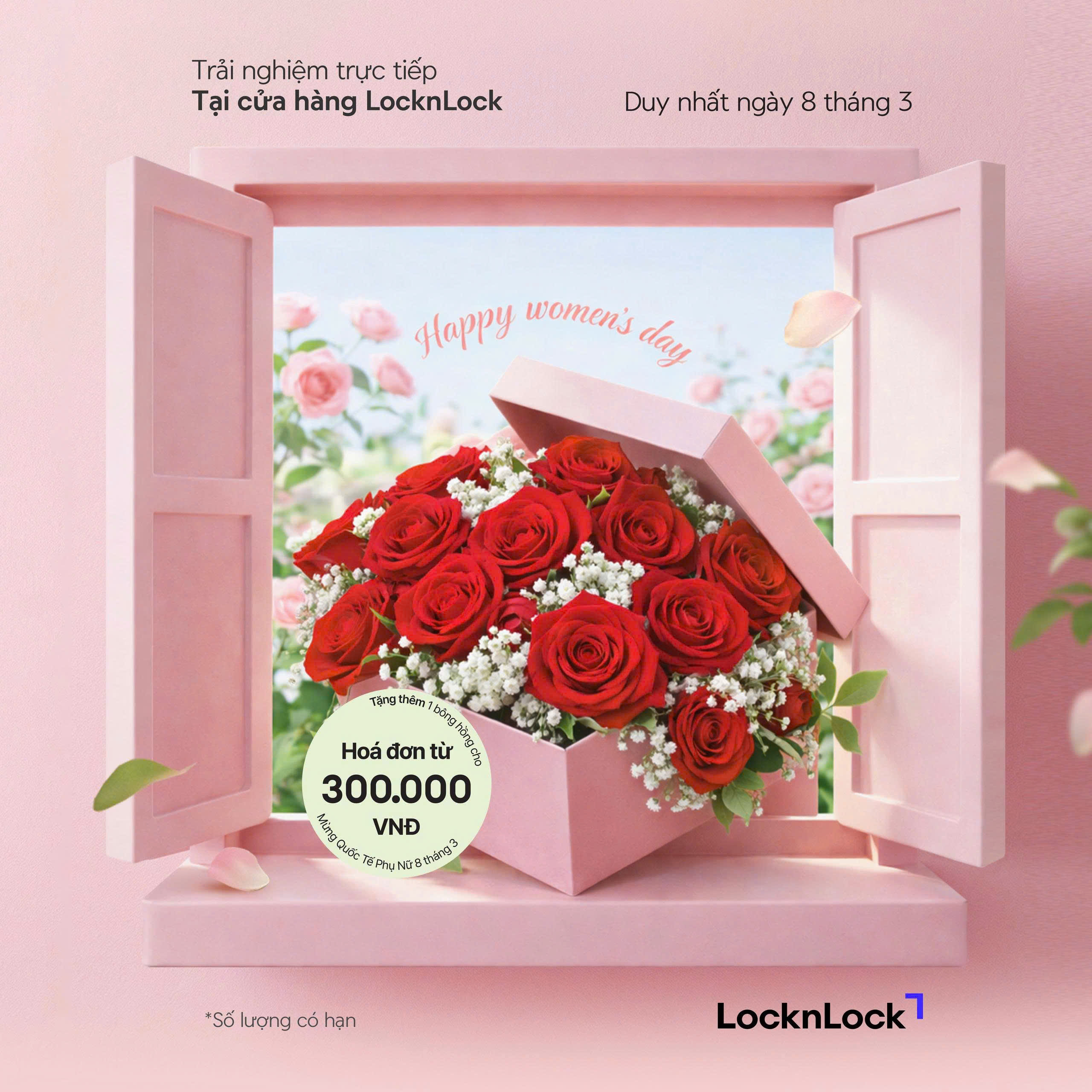 LocknLock gửi tặng 1 cành hoa hồng tươi đến những khách hàng nữ xinh đẹp với hóa đơn từ 300.000đ, như lời tri ân và chúc mừng ngày Quốc tế Phụ nữ.