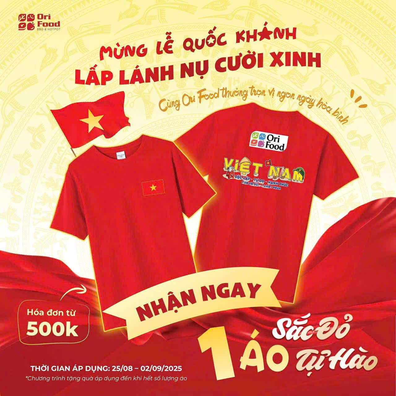 📍Từ 25/08 – 31/8 ( hoặc khi phát hết số lượng áo tặng) Ori Food tặng ngay 01 áo “Sắc đỏ tự hào” cho mỗi hóa đơn từ 𝟱𝟬𝟬𝗸 (áp dụng với 2 cơ sở tại Hà Nội) và từ 𝟭𝟬𝟬𝟬𝗸 (áp dụng với cơ sở tại Bình Dương)