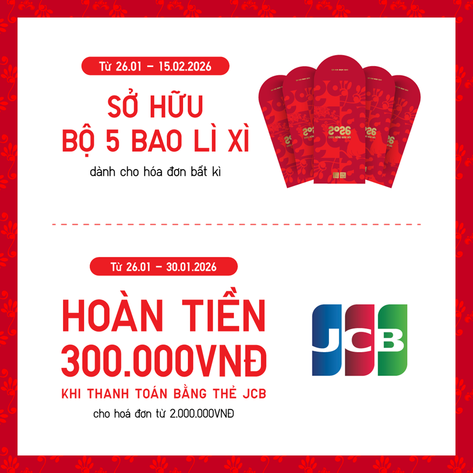 Ưu đãi hoàn tiền 300.000VNĐ khi thanh toán hóa đơn từ 2 triệu đồng với thẻ JCB từ 26/01 đến 30/01