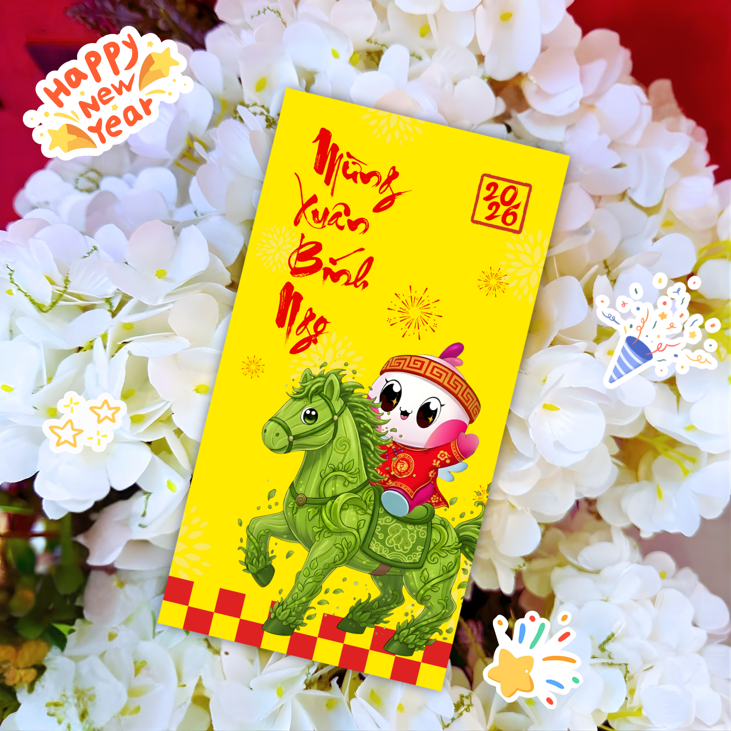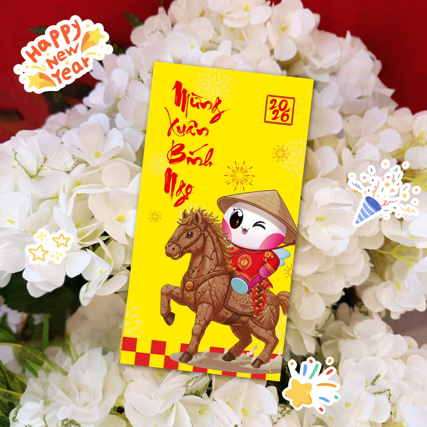 Mỗi bộ gồm 05 bao lì xì, với hình ảnh Cabi cùng 5 linh vật Ngọ đại diện cho Kim - Mộc - Thủy - Hỏa - Thổ, tượng trưng cho sự đủ đầy, thịnh vượng và khởi đầu thuận lợi trong năm mới.