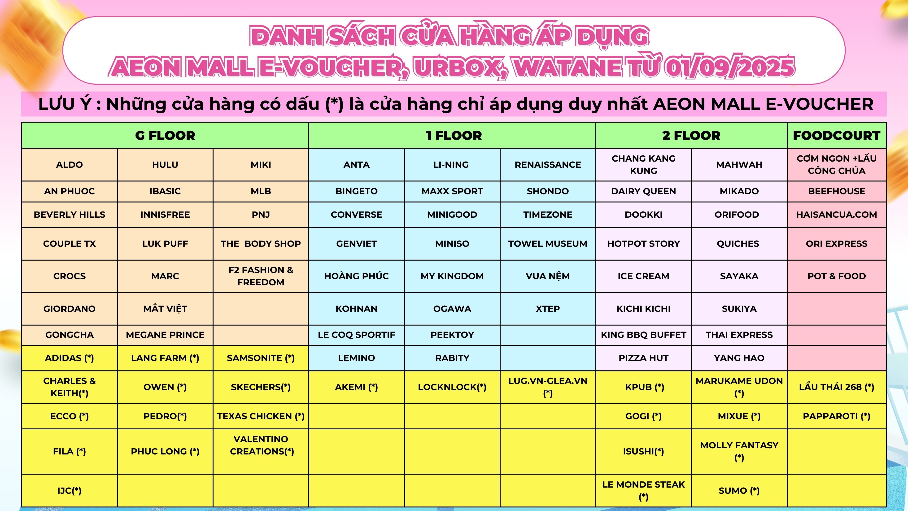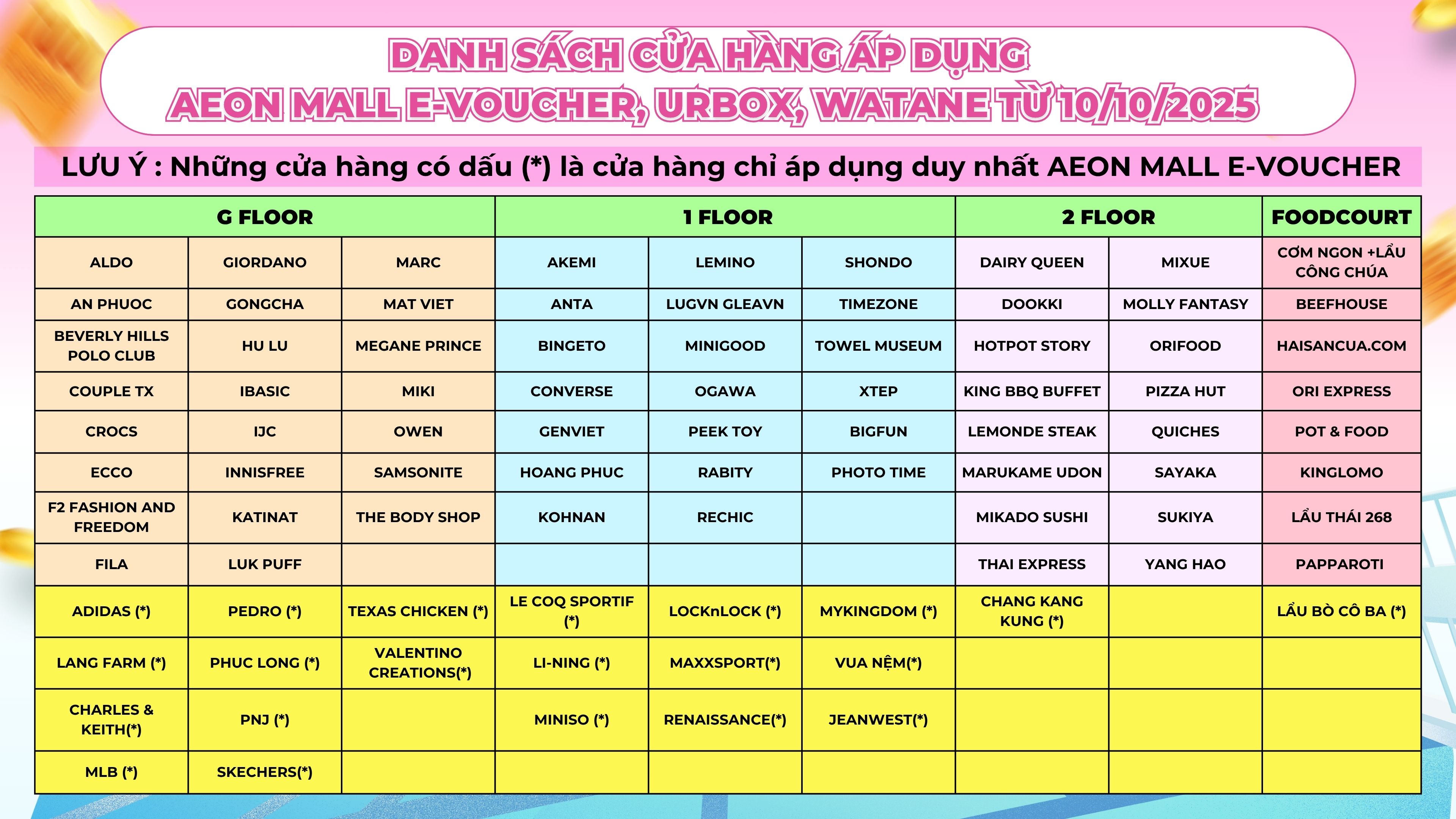 - Danh sách các gian hàng áp dụng thanh toán AEONMALL E-VOUCHER , URBOX, WATANE