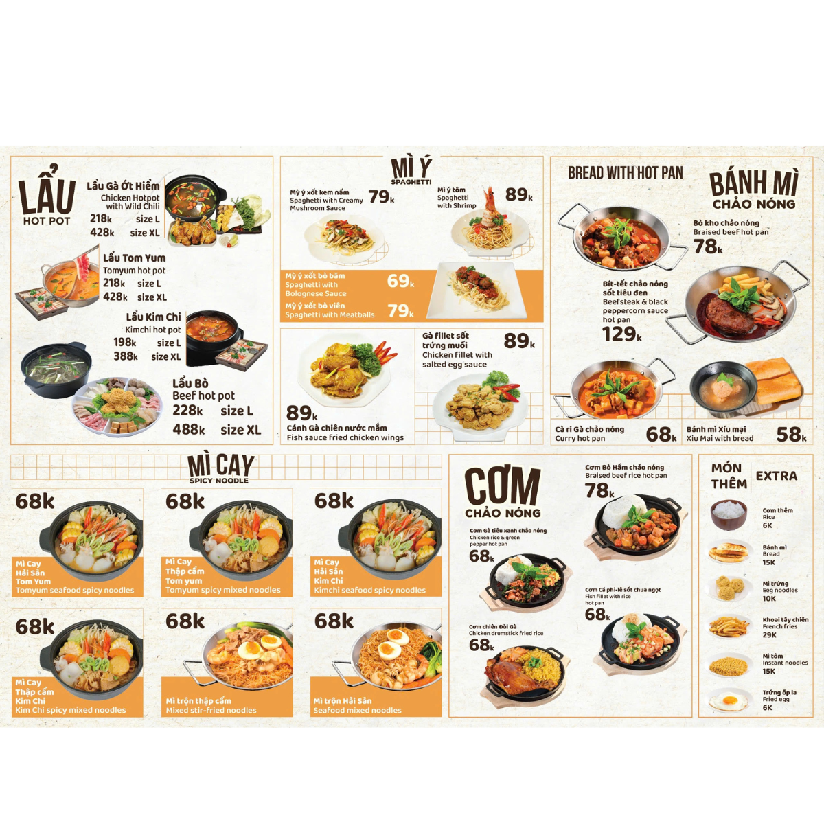 Menu đa dạng với bánh mì chảo xì xèo, hủ tiếu xào mềm mọng hay là món lẩu bò hun hút khói. Ori Express cam kết mang lại bữa ăn phục vụ nhanh chóng, nóng hổi, bắt vị giá chỉ từ 68.000 đồng.
