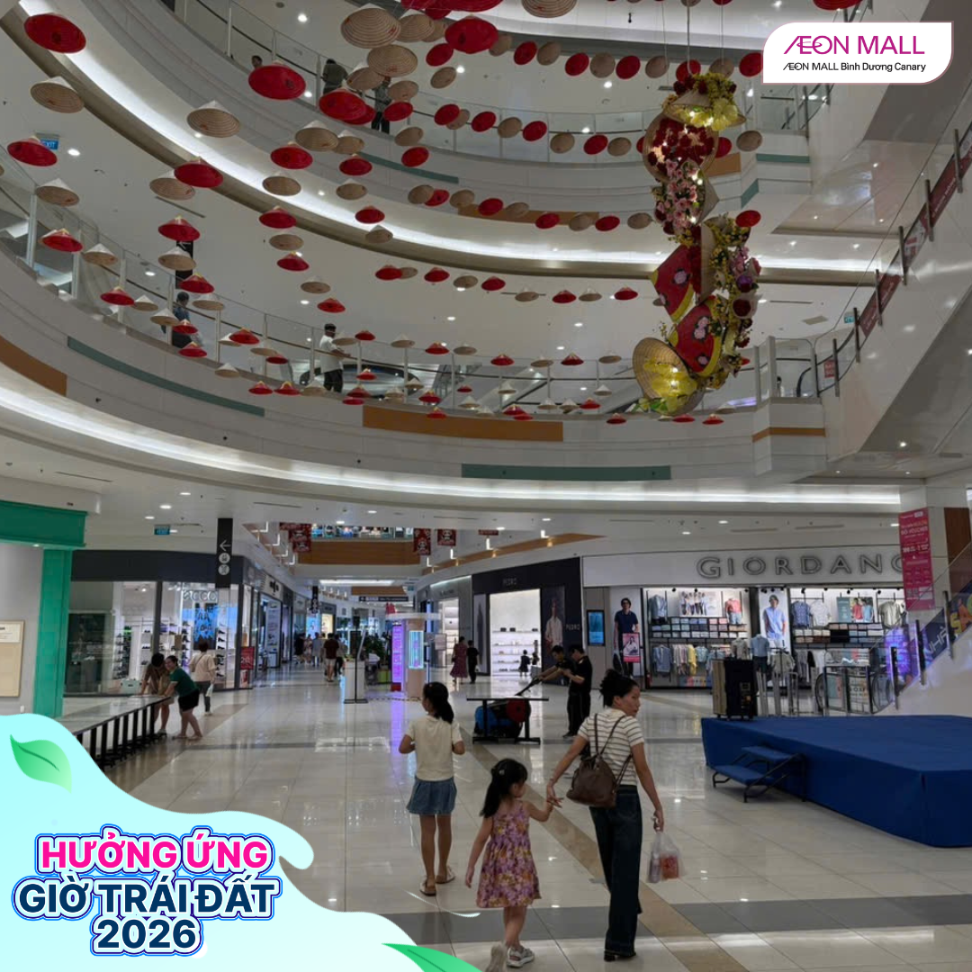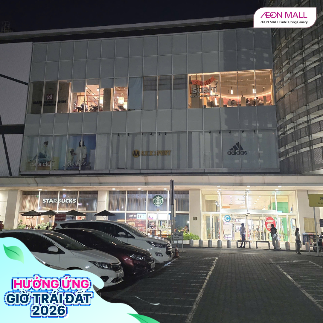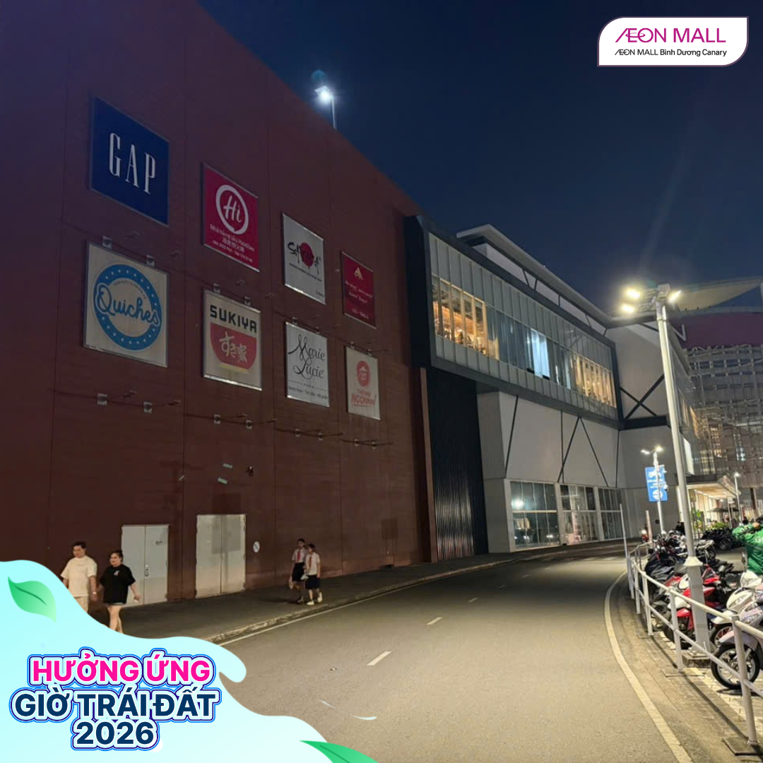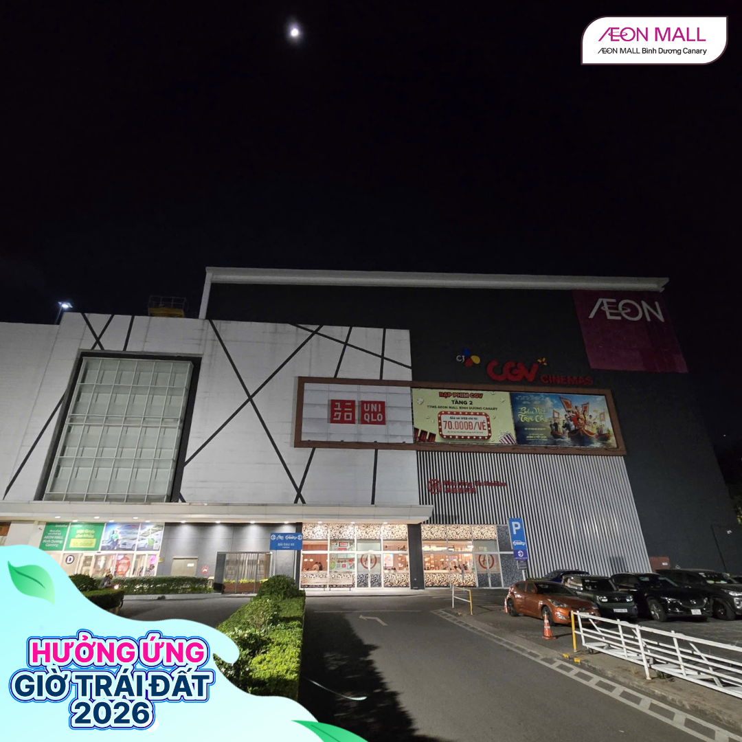 Tối ngày 28/03/2026, từ 18h đến 22h, AEON MALL Bình Dương Canary đã đồng loạt cùng các gian hàng trong trung tâm thương mại tham gia hưởng ứng chiến dịch Giờ Trái Đất 2026 với chủ đề “Sáng tạo xanh – Tương lai xanh”. Đây là hoạt động ý nghĩa nhằm nâng cao nhận thức cộng đồng về tiết kiệm năng lượng và bảo vệ môi trường.
