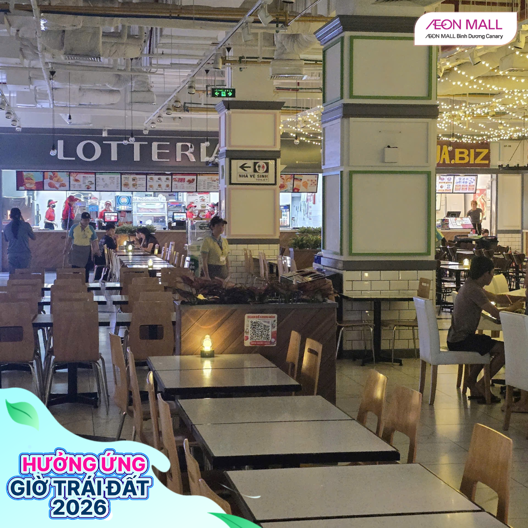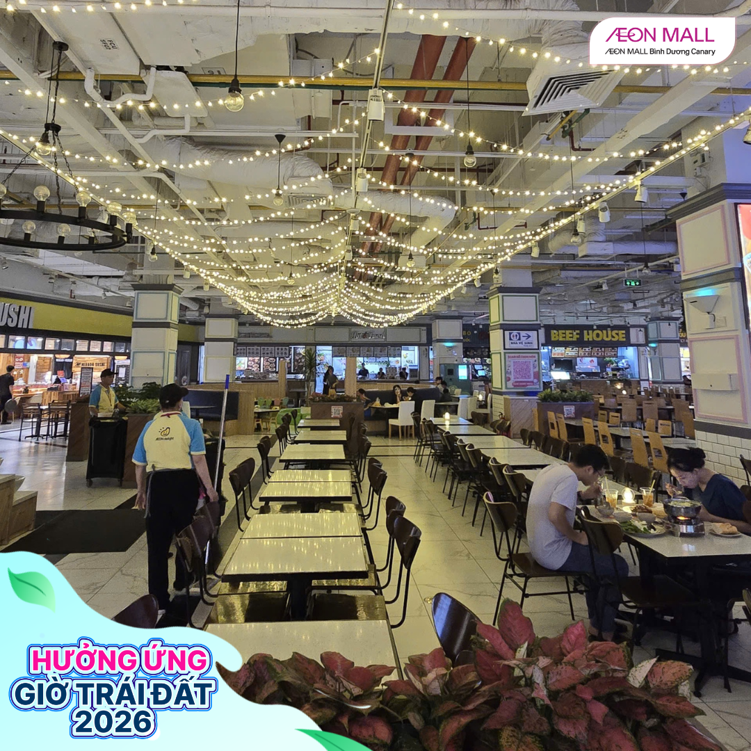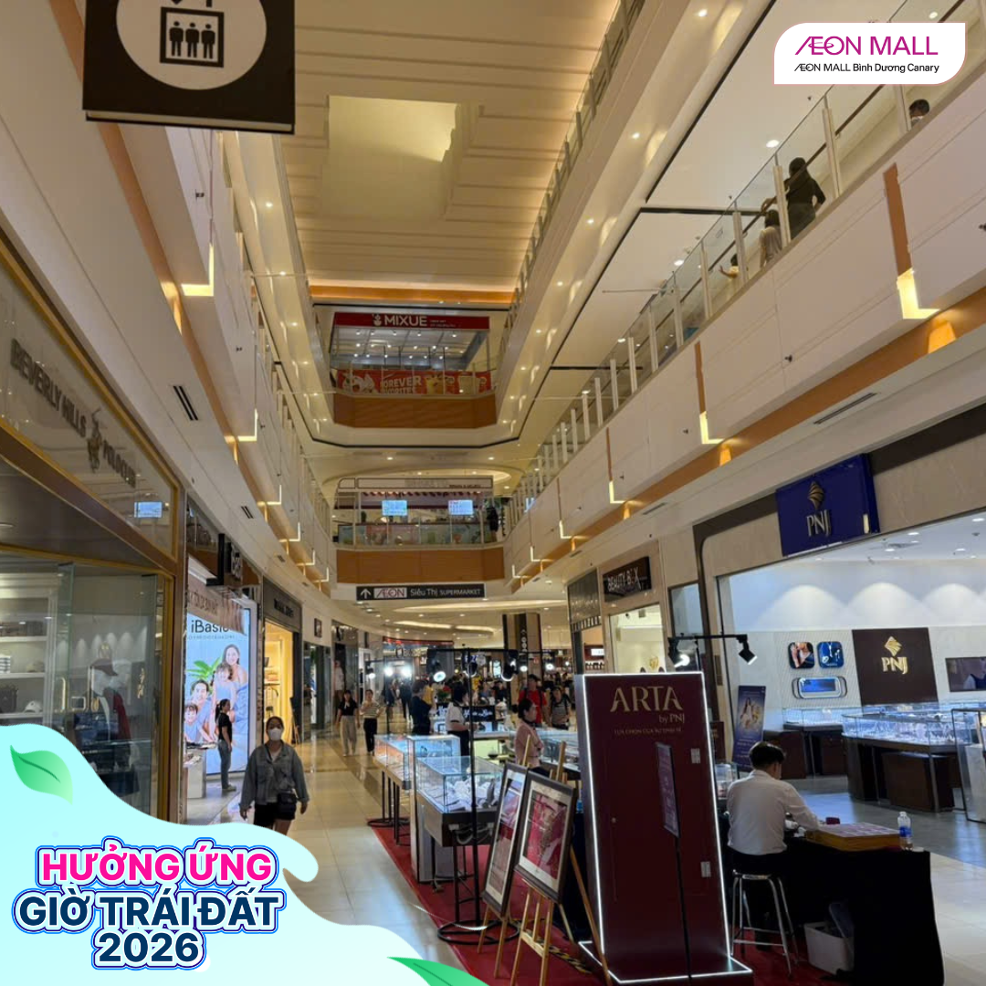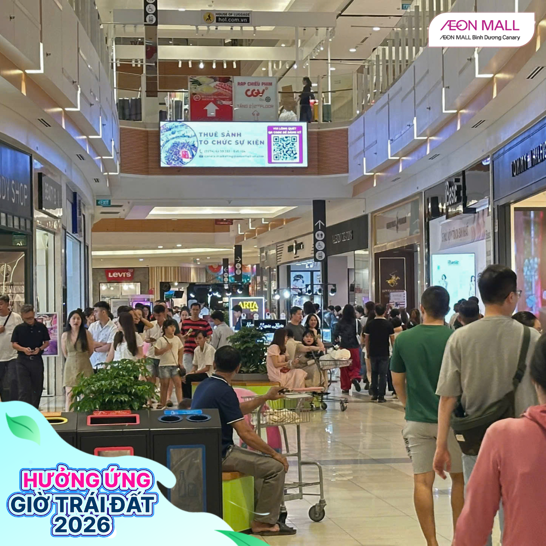 Tối ngày 28/03/2026, từ 18h đến 22h, AEON MALL Bình Dương Canary đã đồng loạt cùng các gian hàng trong trung tâm thương mại tham gia hưởng ứng chiến dịch Giờ Trái Đất 2026 với chủ đề “Sáng tạo xanh – Tương lai xanh”. Đây là hoạt động ý nghĩa nhằm nâng cao nhận thức cộng đồng về tiết kiệm năng lượng và bảo vệ môi trường.