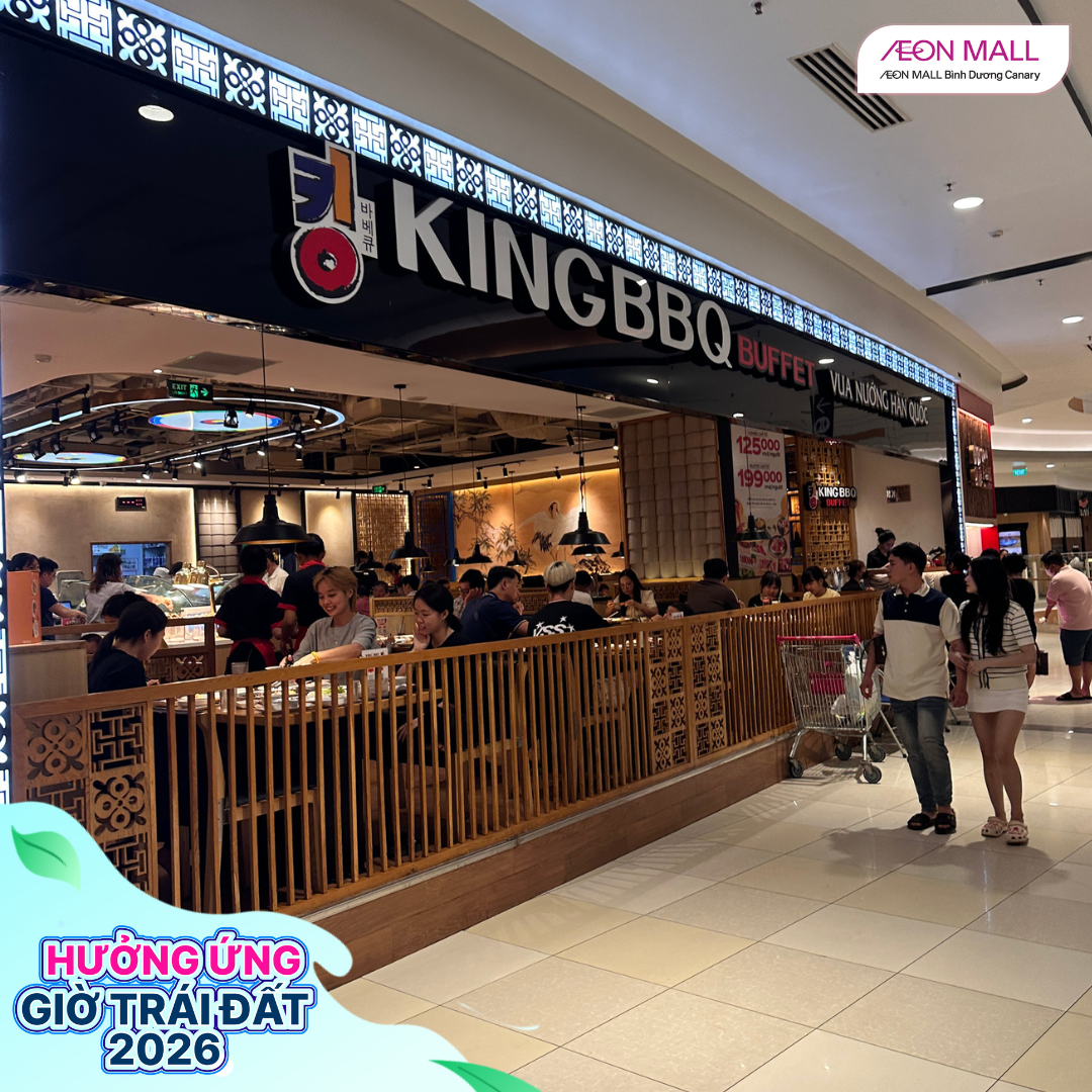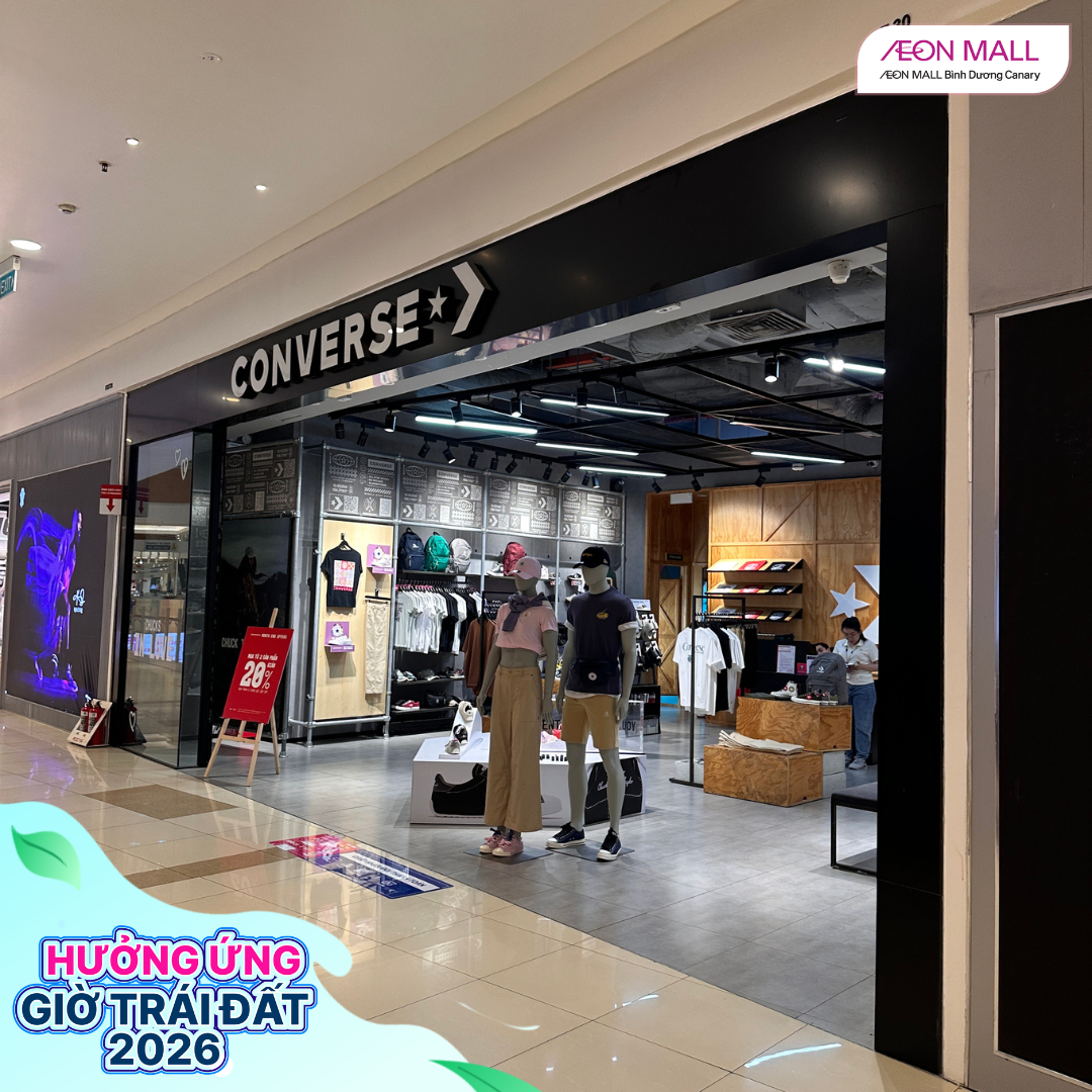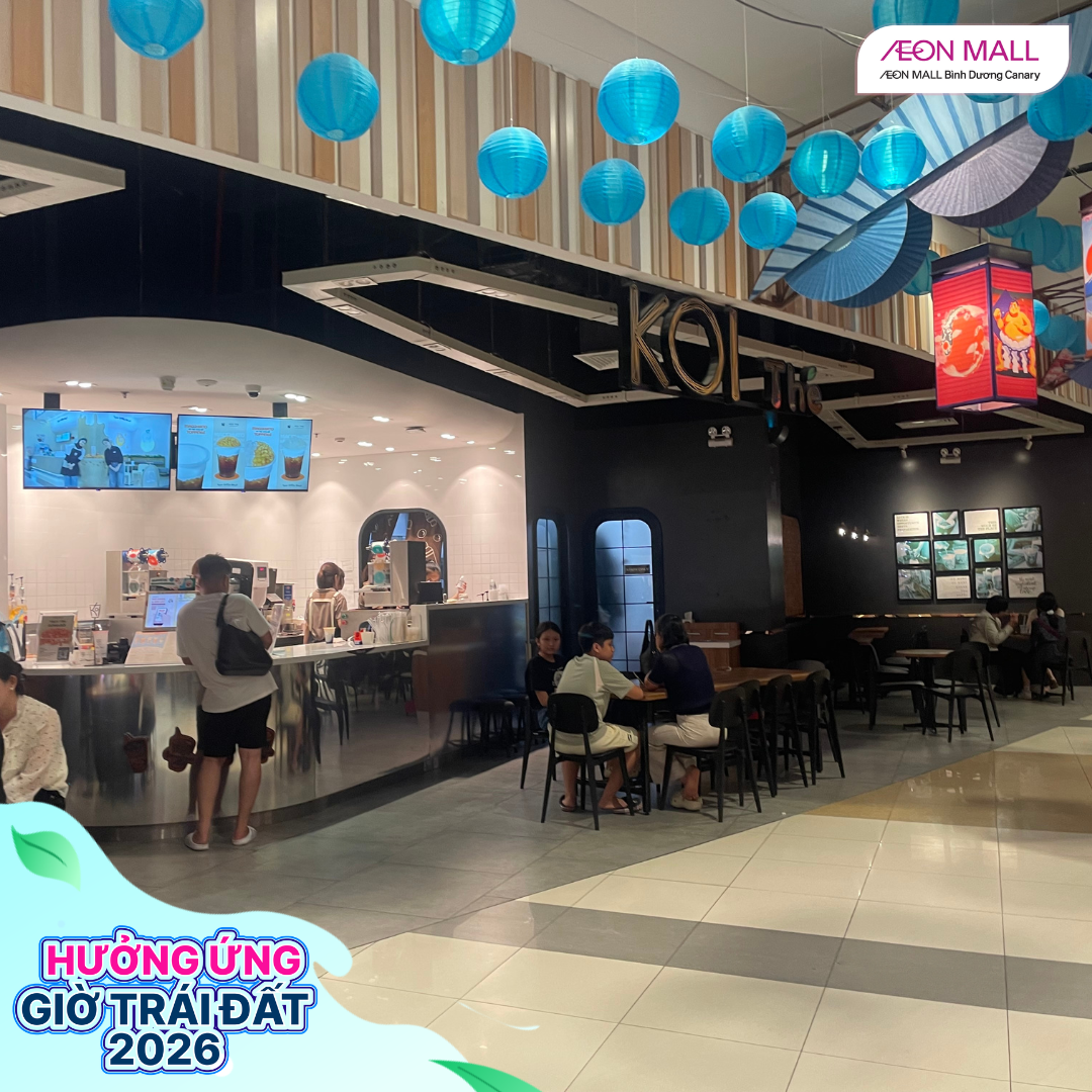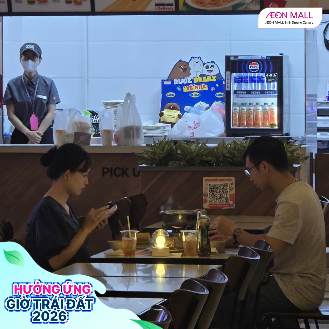 Tối ngày 28/03/2026, từ 18h đến 22h, AEON MALL Bình Dương Canary đã đồng loạt cùng các gian hàng trong trung tâm thương mại tham gia hưởng ứng chiến dịch Giờ Trái Đất 2026 với chủ đề “Sáng tạo xanh – Tương lai xanh”. Đây là hoạt động ý nghĩa nhằm nâng cao nhận thức cộng đồng về tiết kiệm năng lượng và bảo vệ môi trường.